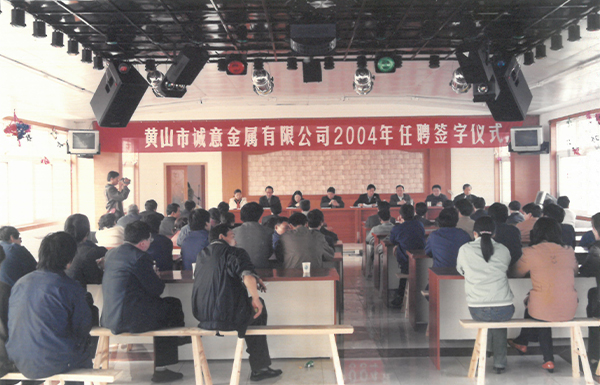 1994年9月26日,汪小五先生創(chuàng)建歙縣誠意制釘廠。1996年改建成立歙縣誠意鉛絲制釘廠。1997年注冊“誠意”商標(biāo)。1999年3月24日注冊成立黃山市誠意金屬有限公司,生產(chǎn)鐵釘、鉛絲,銷售建筑鋼材,當(dāng)年躋身“黃山市民營企業(yè)50強(qiáng)”行列。